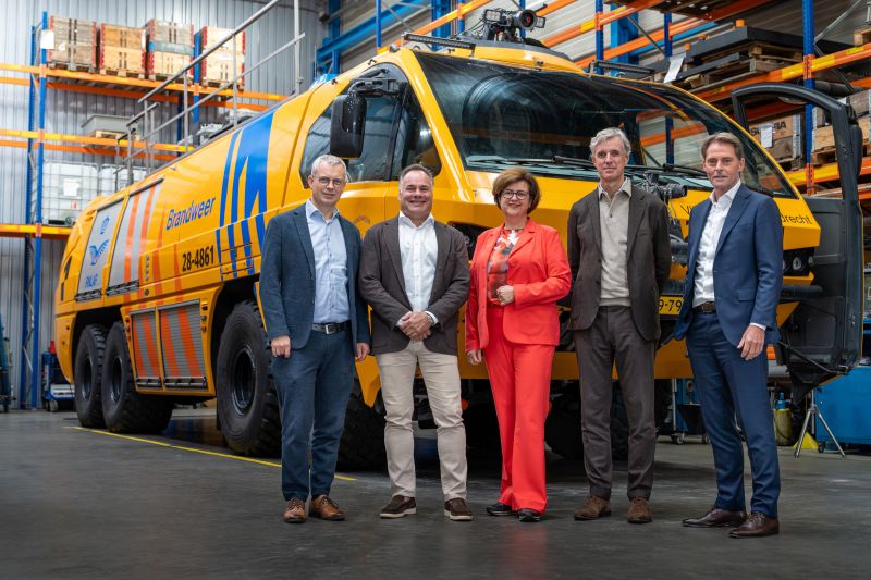 Van links naar rechts: Frank van den Ouden (voorzitter Ondernemersvereniging Hoeksche Waard), Rex Hobbel (directeur Kenbri Fire Fighting), burgemeester Marian Witte, Bart Jan Koopman (algemeen directeur Evofenedex) en wethouder Paul Boogaard.